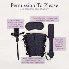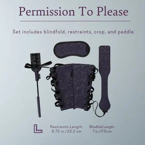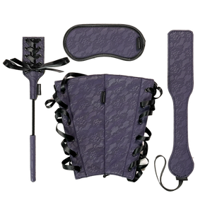 Delve into the world of kink with a luxe, four-part set featuring a blindfold, paddle, crop, and arm restraints. The paddle and crop take painful pleasure experiments to mastery, the blindfold removes sight to spotlight sensation, and the arm restraints bind for sultry submission. Satin accents and plush, lace-print material add a touch of softness to contrast the bold intensity of BDSM play.
